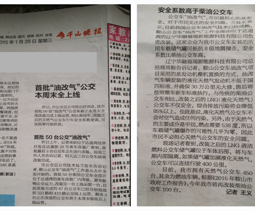 2015年1月28日,千山晚報對我公司50臺公交“油改氣”月底全部改裝完成,并投入運營進行大幅報道,并對公交“油改氣”的****性及環保性各方面進行了介紹。